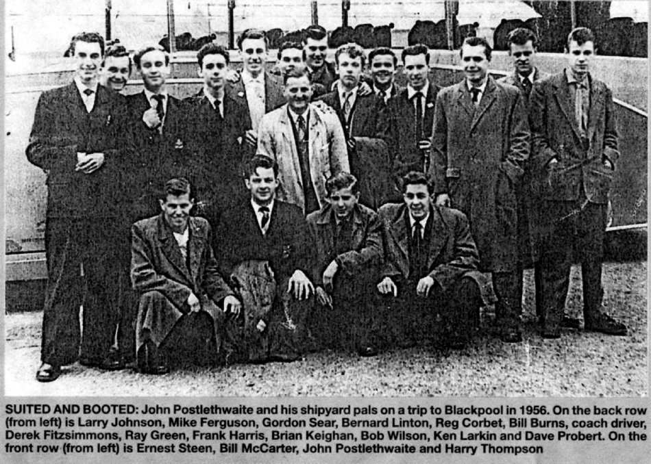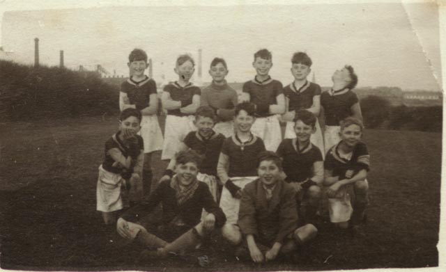 Ocean Road Junior School soccer team 1948/49. Back Row: Peter Lawson, Barry Kent, Jimmy Emerson, Graham Parker, Bertie Bell, Jeff Stubbs. Middle row: Pete Humphries, Steve Pick, Brian Dudley, Brian Day, Barry Dent Front Eric McGladdery , Peter Hall. Taken at Vickerstown school, steelworks in background. Bertie Bell is "Mr. Asda", Graham Parker lives in Biggar Village, Brian Dudley tragically died at a very young age but the rest I would welcome status. Uploaded by Steve Pick from Texas.