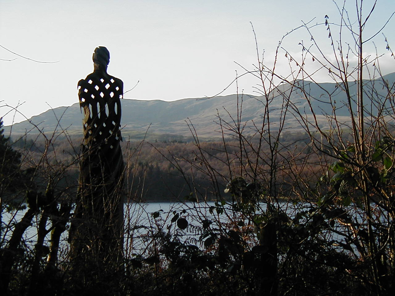 The wood sculpture on the east side of Coniston Lake dated Feb 2001 carved out of oak , and is in the form of a standing man. Uploaded by George Livesey